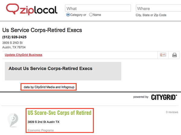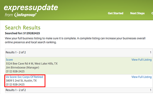 2) Their business name is actually an acronym for “Service Corps Of Retired Executives” -- which is how they’re listed on four of the most prominent local search engines: