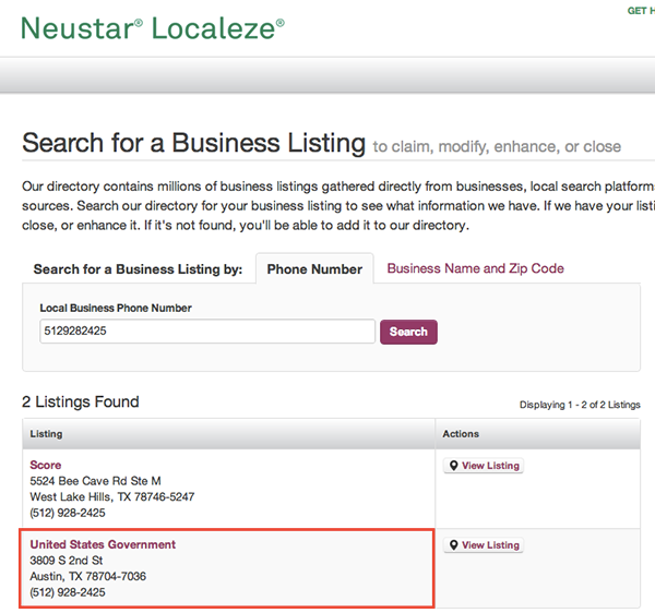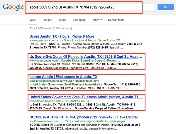 Incorrect (Old) NAP: SCORE Austin 3809 S 2nd St Austin, TX 78704 (512) 928-2425 |