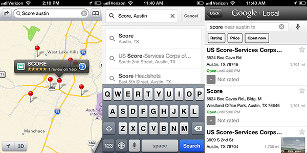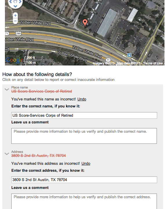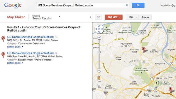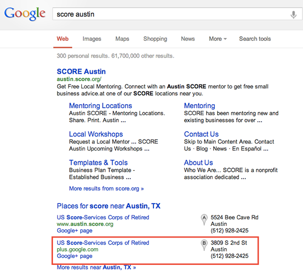 SCORE’s Austin chapter recently moved to a location about eight miles northwest of its old local headquarters. Unfortunately, Google was displaying its former headquarters right on the main search result for “SCORE Austin,” and SCORE clients were actually visiting the old address for meetings and workshops. (In fairness to Google, other search engines were confused as well, though not quite to the same extent.)