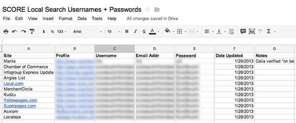 In my spreadsheet, I typically enter the profile page along with username, email address, and password information for each major data source on its own line. I then make a note of the last time I "touched" each listing and any notes that will help me remember special treatment for each.