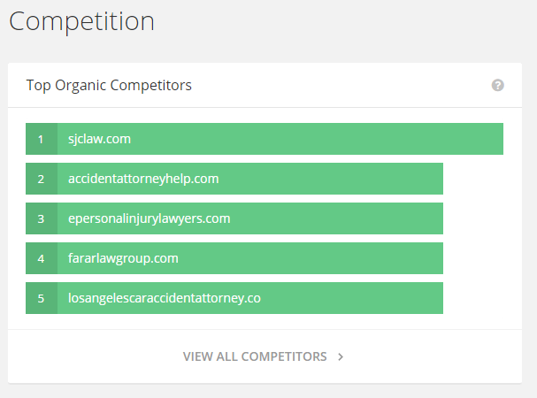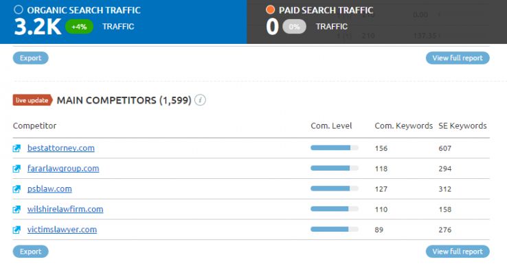 To use the tool, visit www.SEMRush.com and enter your website in the provided search box and hit search. Once the page loads, you simply have to scroll down to the area that says "main competitors". If you click the "view full report" option you'll be taken to a page with 10 competition URLs.
