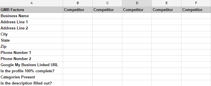 Now that we have a list of competitors, we can really do a deep dive to see who is ranking and what factors might be contributing to their success. To start, make sure to pick your top competitors from the spreadsheet and then look for and record the information below about each business on the Competitor Analysis tab.