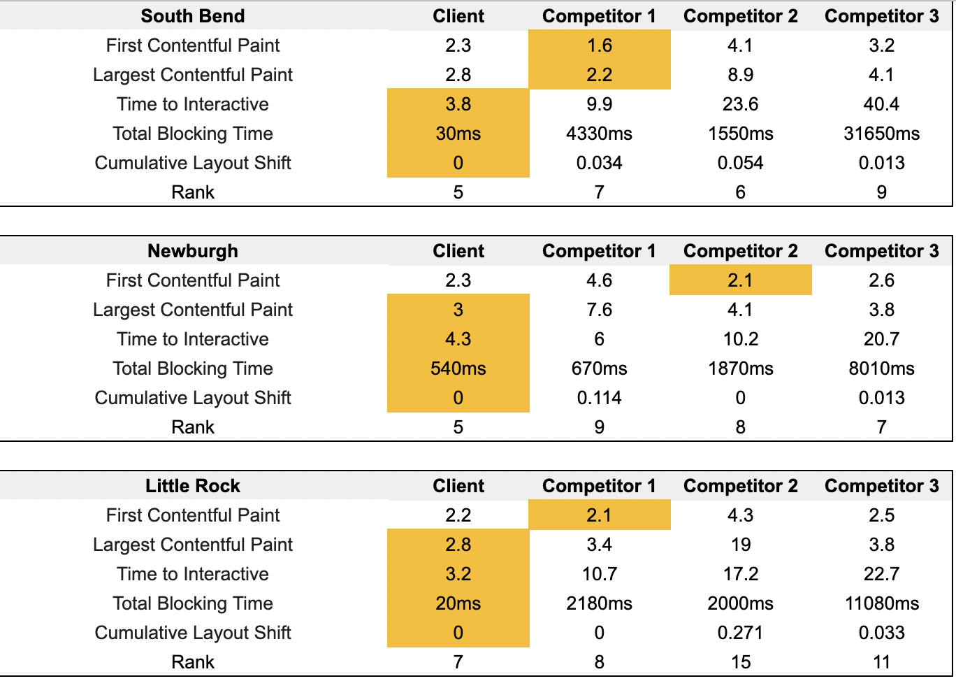 We also reviewed the CRux data for our client in comparison to closely-ranked competitors. The winner for each UX/speed element is highlighted in yellow. As you can see, our client’s scores are generally higher than competitors that do not rank as well: