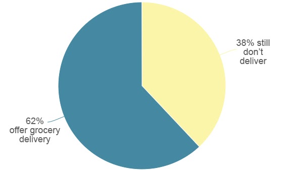62% of the stores in my survey set are now offering home grocery delivery. I was surprised that this number wasn’t higher, given consumer demand for the safest ways to keep their households supplied, coupled with the clear need to keep grocery workers as safe as possible.