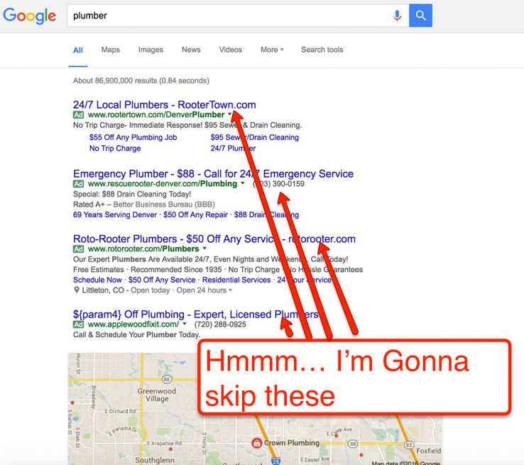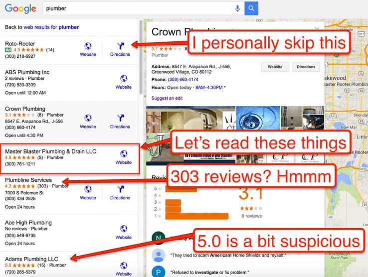 Let's talk user behavior for a moment, because it's super important. Imagine you find yourself in the bummer of a situation I was in last week. I needed a plumber. To find one, I decided to turn to Google (since I spend all day there anyway) to search for a local plumber. Here's my personal journey.