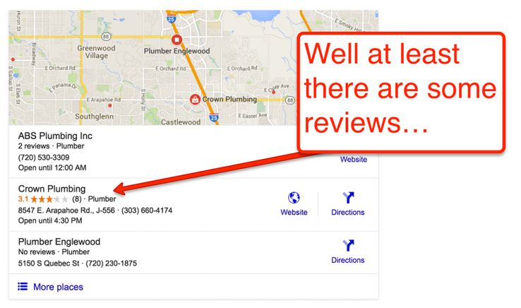 We'll talk more about this later, but if you do a lot of local searches you'll also see that businesses without many reviews (or less reviews than their competitors) can certainly still rank high.