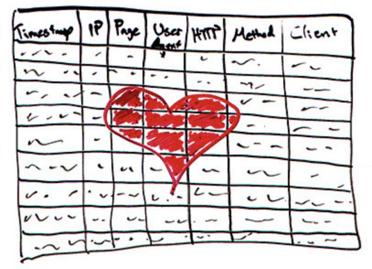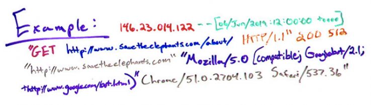 It's a word I just made up, and it just looks like that. It's just like bleh. What is that? It looks crazy. It's a new language. But essentially you'll likely see that IP, so that red IP address, that timestamp, which will commonly look like that, that method (get/post), which I don't completely understand or necessarily need to use in some of the analysis, but it's good to be aware of all these things, the URL requested, that status code, all of these things here.