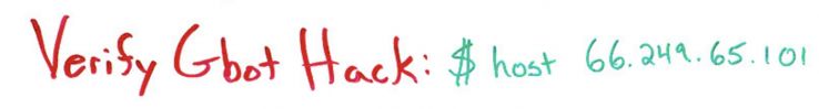 I tried to draw it. It looks like that. But all you do is you type in "host" and then you put in that IP address. You can do it on your terminal with this IP address, and you will see it resolve as a Google.com. That verifies that it's indeed a Googlebot and not some other crawler spoofing Google. So that's something that these tools tend to automatically take care of, but there are ways to do it manually too, which is just good to be aware of.