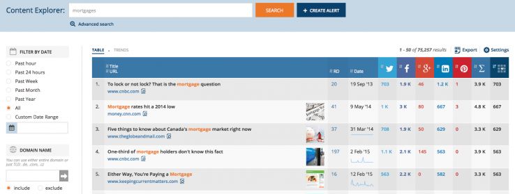 Below, we see a search for "mortgages" using the tool, and we are presented with a list of content on that subject sorted by "most shared." The result can be filtered by time frame, language, or even by specific domain inclusions or exclusions.