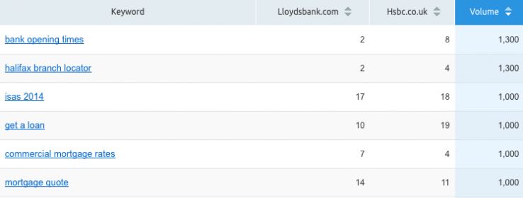 If we were working for HSBC, for instance, it would be the blue portion of the chart we would be most interested in in this scenario. We can download a full list of keywords that both banks rank for, and then sort by those that HSBC don't rank for.