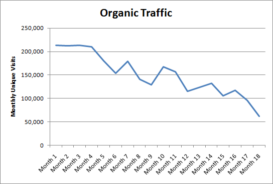 This is a graph of organic traffic for a theoretical site - they might be in an industry such as print advertising, construction equipment or VHS rental. The decline in traffic is pronounced and serious.