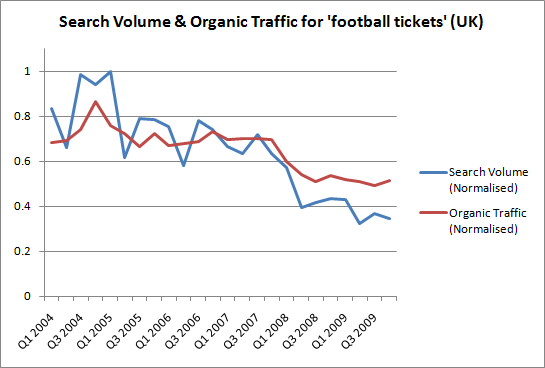 If you have been collecting ranking data in the past, then it can be useful to identify a term for which you've had a relatively static ranking over the last year or so. If your traffic from this term has declined over the same period then this provides a useful example of how market behaviour outside of your control is having an effect on the business.If you don't have historic ranking data, but suspect that your industry is in decline, you should compare search volume trends to organic traffic sent by some specific terms. In the example below, the site sees a decline in traffic for the single keyphrase 'football tickets' but comparing this to the search volume for the term shows that the site's performance has actually improved - they are increasing their share of that traffic.