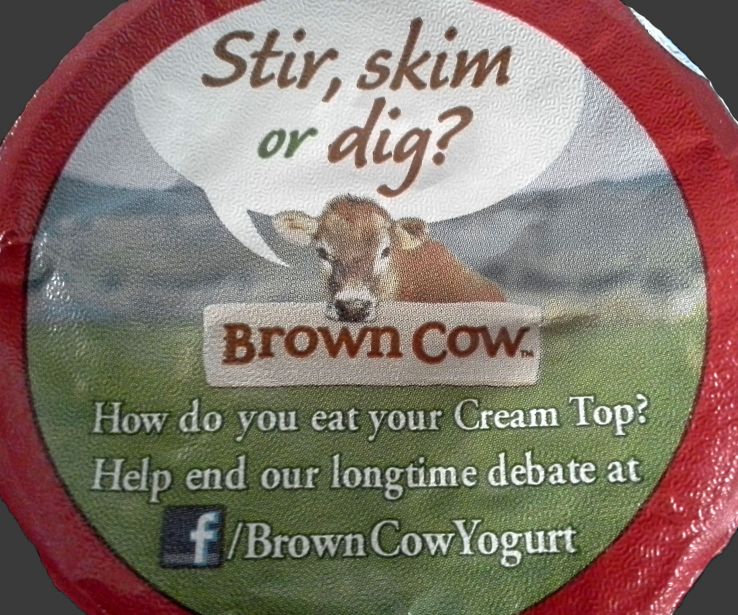 - And, finally, because not all content is online, I love the way yogurt maker Brown Cow uses the lids of their yogurt to playfully highlight the many ways a customer could eat the yogurt's cream top. This both signals to me that the yogurt has a cream top (not everyone's favorite) and shows me new ways to experience it: