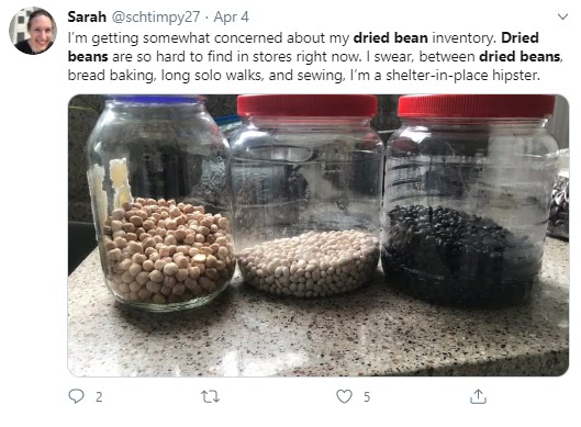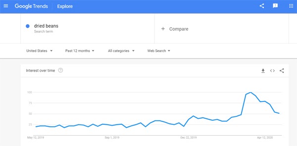 Here’s an example of a problem. My household eats legumes at least twice a day in some form. We’ve always been able to get dried beans, lentils, and peas in bulk from the grocery store. However, with the public health emergency, stores ran out of stock and we had to order boxed products from an international brand headquartered far away. I can check to see if the problem I’ve noticed locally is part of a larger phenomenon by looking at Google Trends: