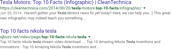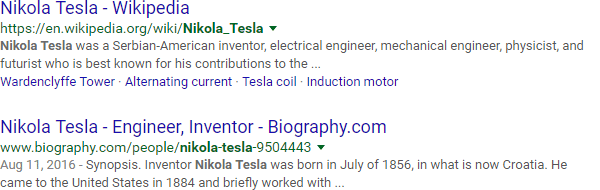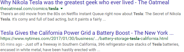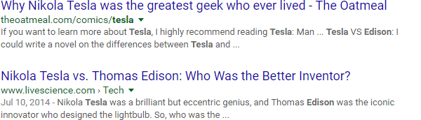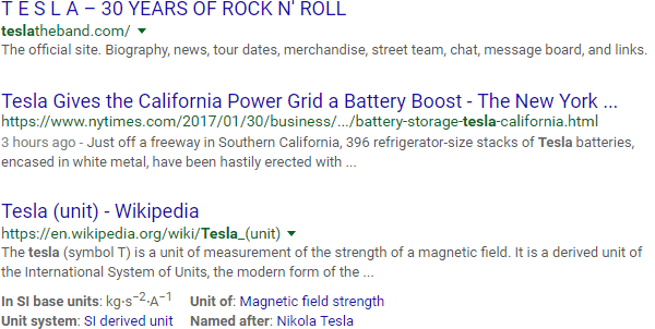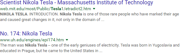 Let's say you've got a blog post to write about the inventor Nikola Tesla. You hop over to Google and search "tesla," only to find a lot of results like this: