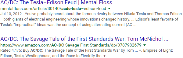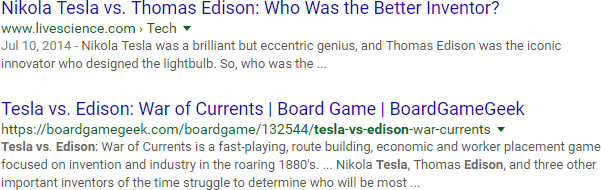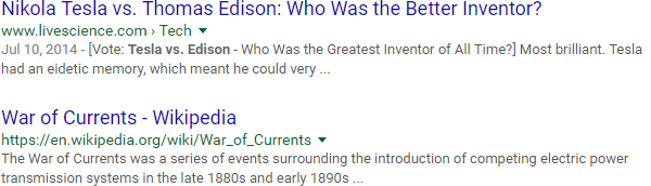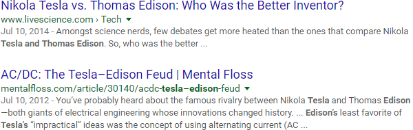 You've settled on using "Tesla vs. Edison" in your title, so let's do a quick check on content with that exact-match phrase: