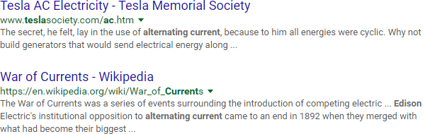 Some operators, including OR, are more useful in complex searches. Here, we're using parentheses to group "tesla OR edison" and then are adding "alternating current" as an AND condition: