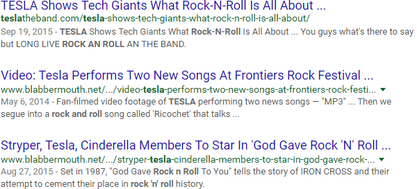 This is a lot closer to what you probably expected. Notice the highlighting in the second result, where Google seems to have matched "AC-DC". This is a lot closer than the previous attempt, but Google is still taking some liberties with the forward slash. Be sure to do a sanity check of results any time you use non-alphanumeric characters in a search.