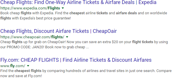 Here, Google is free to match on synonyms for "discount" (such as "cheapest"), but every result is forced to include "airfare." Exact-match single words when you want to exclude variations of that word.