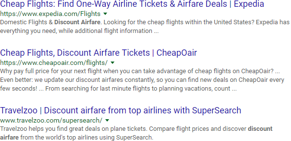 Obviously, the results may still contain synonyms (naturally written content often does), but using exact-match ensures that there will be at least one instance of "discount airfare" in each of the results you get back.