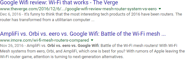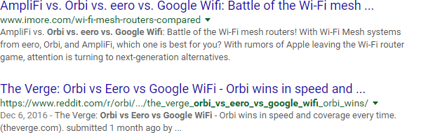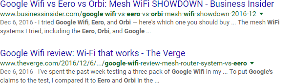 The other day, I was searching for articles that specifically compared Orbi, Eero, and Google Wifi networking hardware. Something odd happened when I searched on the exact-match phrase:
