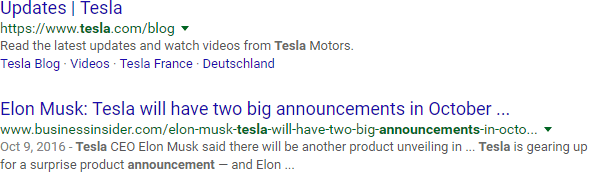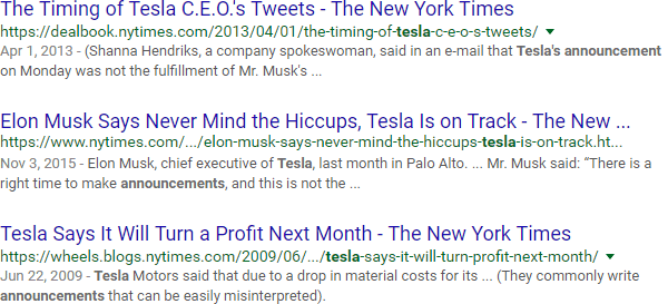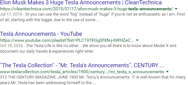 Browsing these results, you can see quickly that Tesla is also a band and a unit of measurement. In addition, Tesla the company makes products other than cars. Keyword exclusions are also called "negative keywords" (thus the minus sign).
