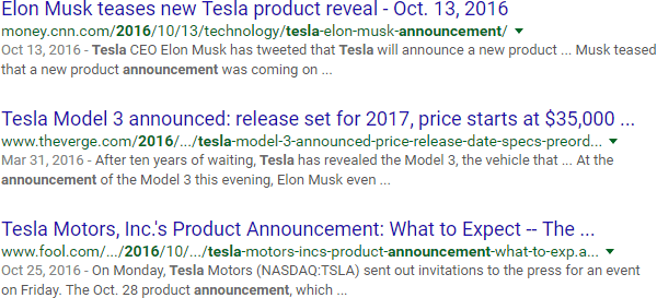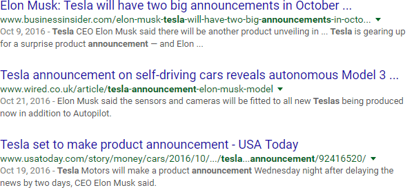 You can use the "inanchor:" operator to search inside linked text. So, for example, the search above looks for sites being linked to from sites using "tesla announcements" in the linked text. In other words, the results represent the targets of those links (not the sources):