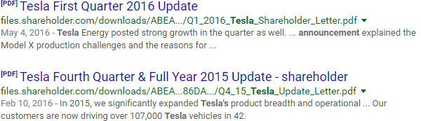 The "filetype:" operator lets you specify an extension, such as PDF files. Let's say you only want Tesla announcements that have been published as PDFs: