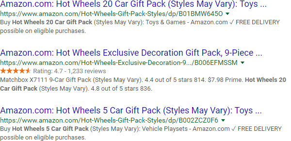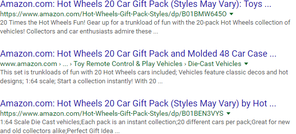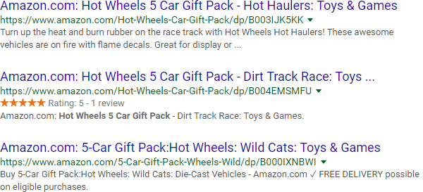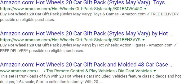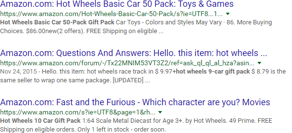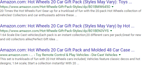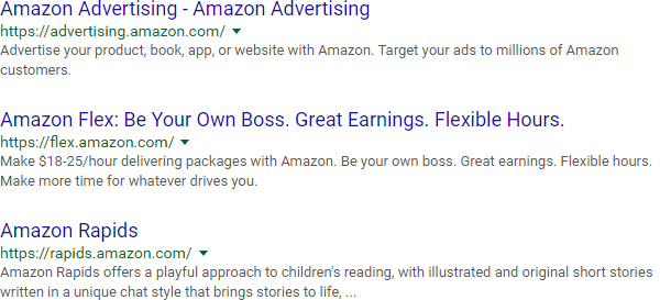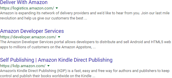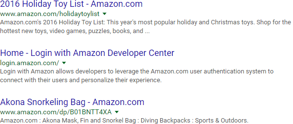 It all starts with the "site:" operator, which, at its most basic level, can help you get a glimpse of how Google indexes a site. Here are a few results from Google's index of Amazon.com: