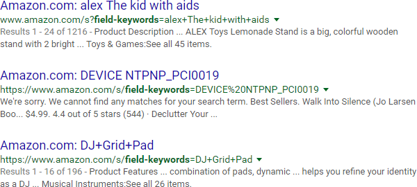 You can also use "inurl:" to target URL parameters on dynamic pages. For example, let's say you want to see what kind of internal search pages Google is indexing on Amazon: