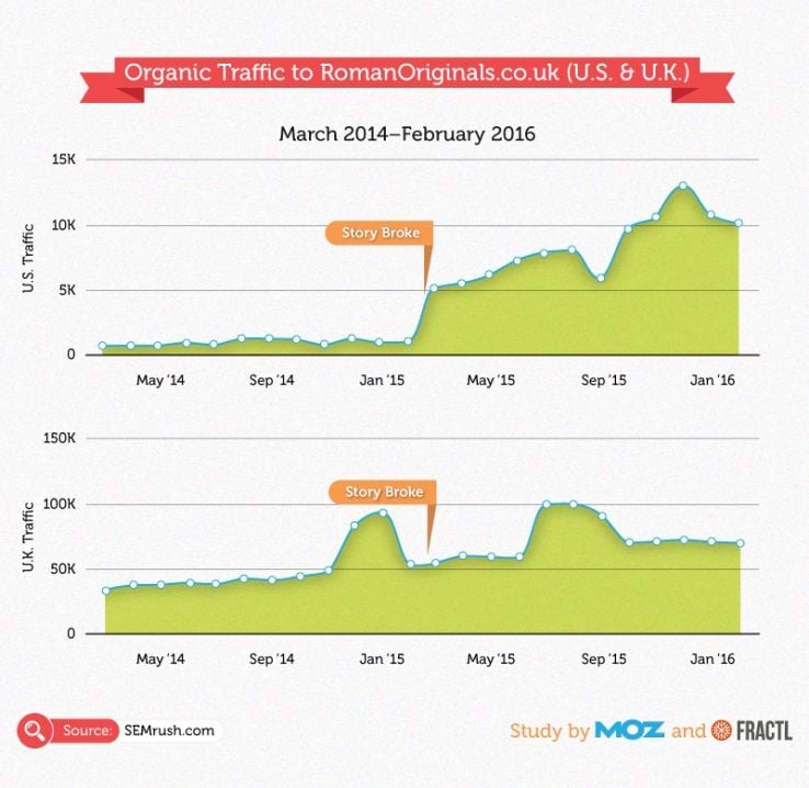 Beyond the short-term increases, it appears Roman Originals gained significant long-term benefits from the media frenzy. Its site has seen a lift in both UK and US organic traffic since the story broke in February 2015.