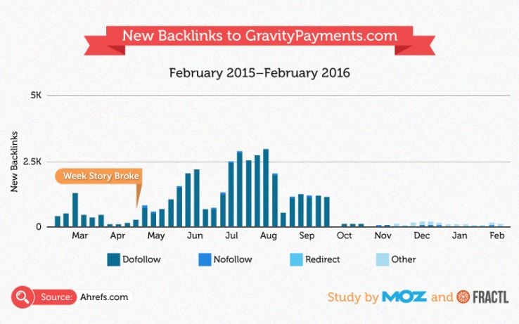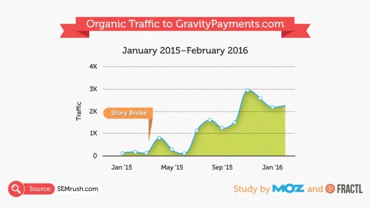Initial spikes after the story broke included a 90% increase in press mentions, 139% increase in organic traffic, and 146% increase in new backlinks. But it didn’t end there for Gravity Payments.