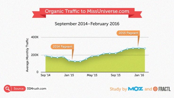 After the incident, there was nearly a 123% increase in monthly organic traffic to MissUniverse.com compared to the month following the 2014 Miss Universe pageant. However, organic traffic had steadily increased throughout 2015. For this reason, it’s difficult to give Steve Harvey's flub all the credit for any increases in organic traffic. It’s also too early to measure the long-term impact on traffic.