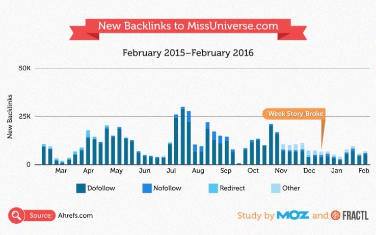 It’s also difficult to gauge how much of an effect it had on backlinks to MissUniverse.com. Judging from the chart below, so far there has been a minimal impact on new backlinks, but this may change as more articles related to this story are indexed.