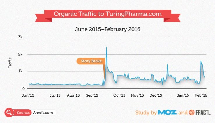 During the month after the story first broke, turingpharma.com saw a 318% increase in organic traffic. Traffic also spiked in December and February, which is when Shkreli’s arrest, resignation as Turing CEO, and congressional hearing were making headlines.