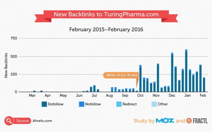 Turingpharma.com also saw a significant increase in backlinks after the story broke. Within a month after the story broke, the site had a 382% increase in new backlinks.