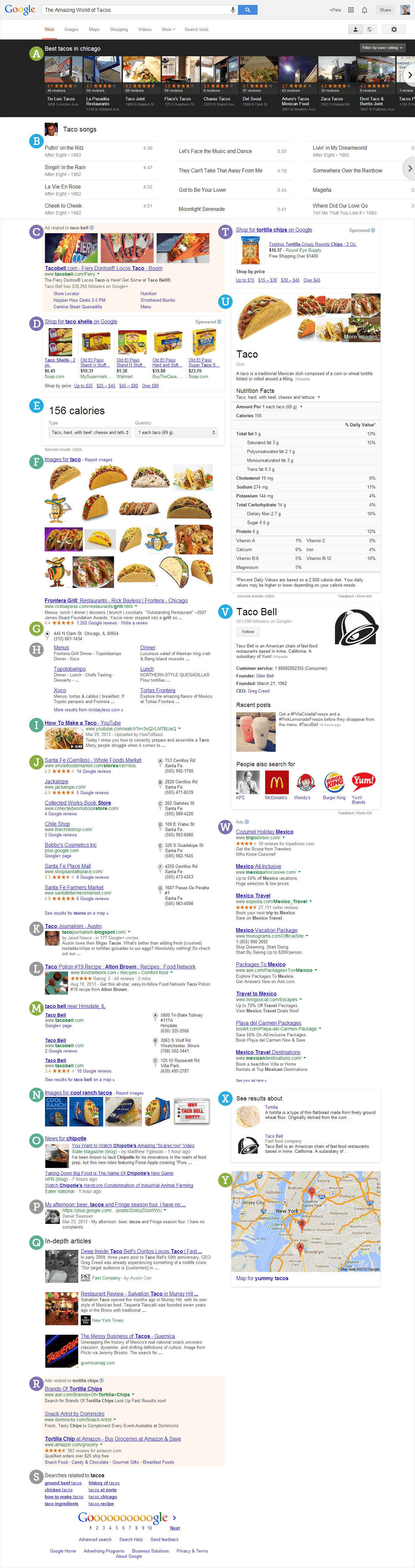 This is not a real Google SERP, although it is constructed from real results. Many of these features do not occur together in the wild. For example, you can have top+side or top+bottom AdWords blocks, but not all three. Statistics (after the image) were taken from 10,000 queries over the week of September 22, 2013 (daily average, as measured by the MozCast Project). These queries represent a variety of lengths and volumes, but do tend to skew commercial. This post is not an endorsement of any taco-related product or service, but I do love me some tacos. Without further ado, I give you Mega-SERP (click on the image for a full-sized version):
