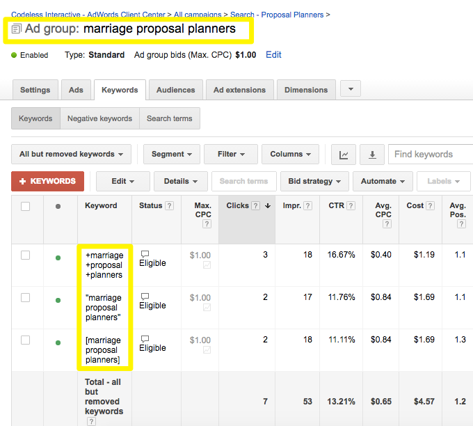 For example, one Ad Group would have a single keyphrase with each match type, like the following: