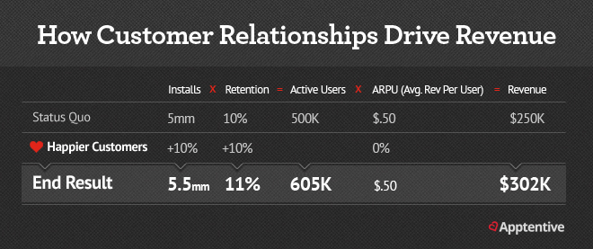 In this example, we're making very conservative assumptions about the impacts on installs and retention and not even assuming any impact on ARPU. Many businesses find that their happiest customers spend 1000% or more of the average consumer, so this is a place where a lot of ROI is uncovered over time as well.