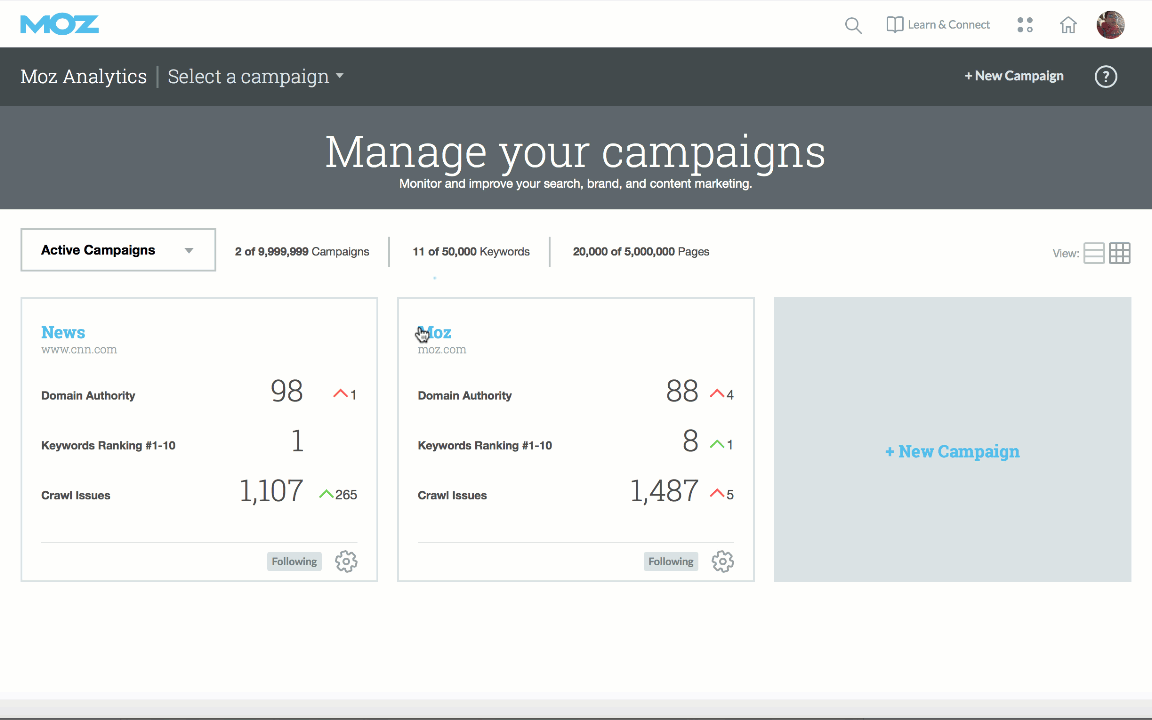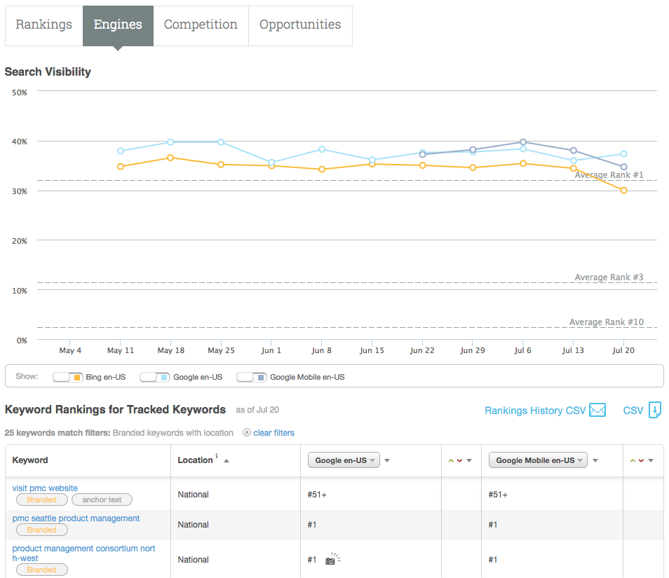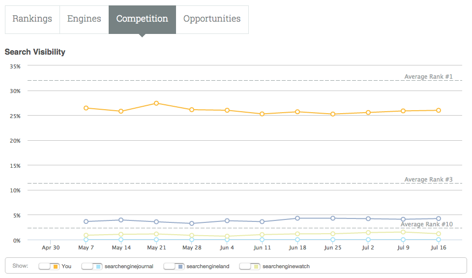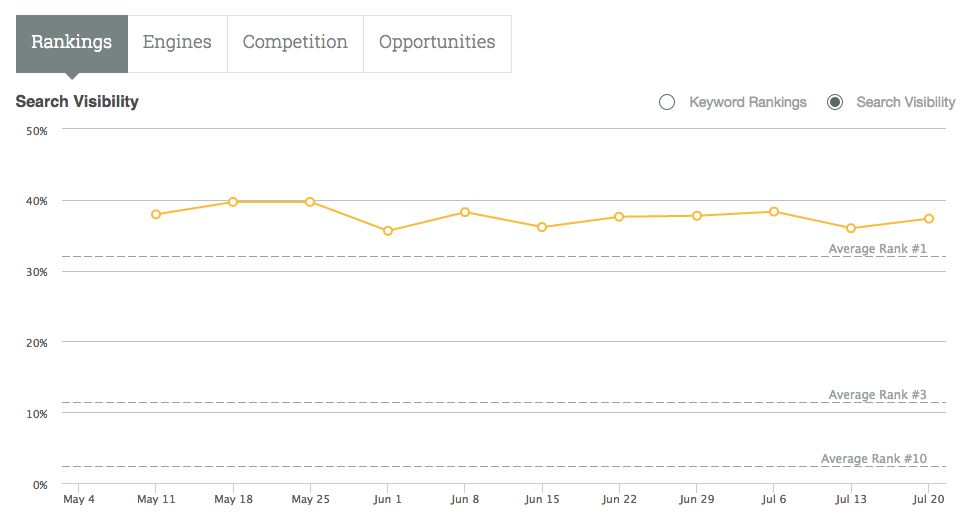 Along with this change we have also added a Search Visibility score to your rankings data. Use your visibility score to track and report on your overall campaign ranking performance, compare to your competitors, and look for any large shifts that might indicate penalties or algorithm changes. For a deeper drill-down into your data you can also segment your visibility score by keyword labels or locations. Visit the rankings summary page on any campaign to get started.