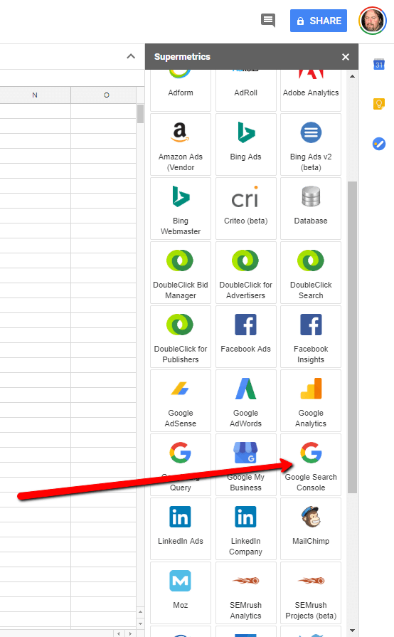 Next, all you have to do is work down the list in Supermetrics. Data Source, Select Sites, and Select Dates are pretty self-explanatory. When you reach the “Select metrics” toggle, choose Impressions, Clicks, CTR (%), and Average Position.