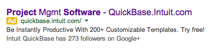 Why shorten "management" to "mgmt" just to throw both Intuit AND Quickbase in there? To me, that's brand overload. I like to think of paid ads that are not based on a branded search as needing an application of " Message Before Brand." Your brand experience will be introduced after they sign up or through the communication of your page copy. Throwing your name in the ad can waste precious space with a name that people might not be familiar with.