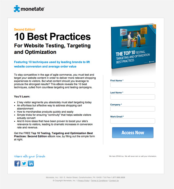 - The attention ratio is pretty great. I'd ditch the social share buttons at the bottom as most people will not give a crap about sharing the page at this point. You should ask them to do that on the form confirmation page as we discussed in part 6. Note that for paid search landing pages, it's often important to include a link to your privacy policy (in the footer) as a trust signal to the ad bots. It can sometimes give your Quality Score a boost.