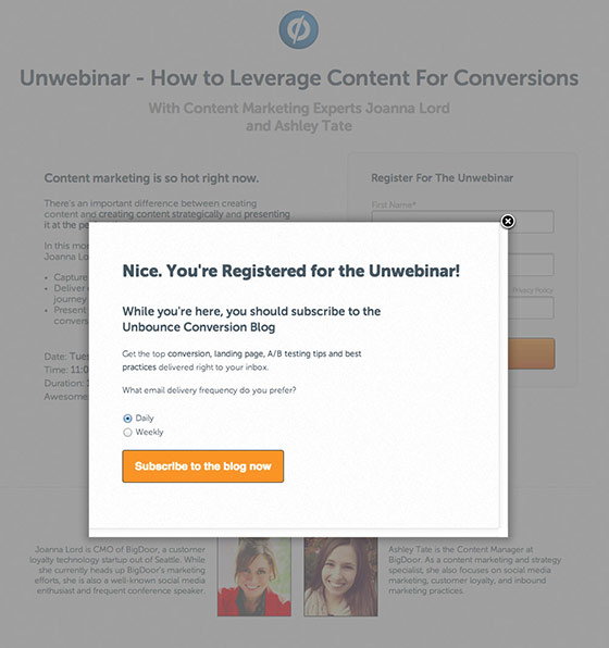 2,500 people registered for the webinar, and of those 40% subscribed to the blog! That's 1,100 extra blog subscribers just by adding a CTA to the confirmation page of a webinar lead gen form.