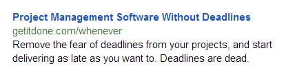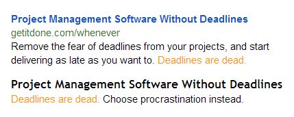 This example introduces aspects of a concept called conversation momentum, which I'll get to in part 2. But basically you can see that the subhead repeats the end of the ad description "Deadlines are dead." and finishes the sentence like people do when they're in the gushy part of a relationship "Choose procrastination instead".