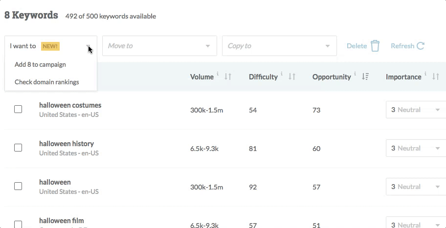 This was at the top of the list of feature requests at launch. Now you can take the keywords in your carefully cultivated list and add them directly to a campaign for ongoing rank tracking.