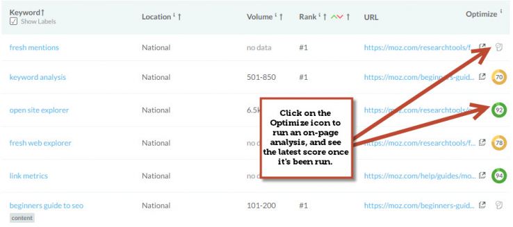 Quickly run page optimization reports and view page optimization scores right from your rankings.