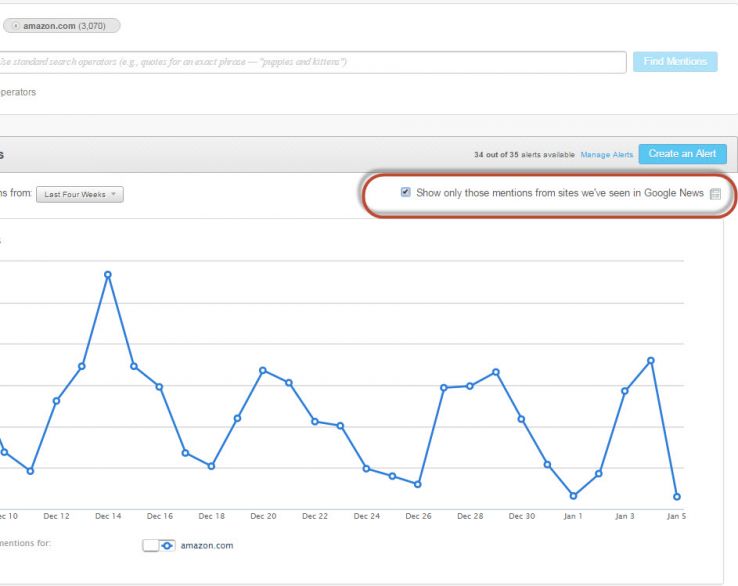 Filter your searches and/or alerts to show only those sources/domains we've observed in Google News. E.g. here's a search for Amazon.com with news filtering on (3,067 results in the last 4 weeks) vs. the same search with news filtering off (28,798 results). This can save a lot of time when you're looking for the most important results.