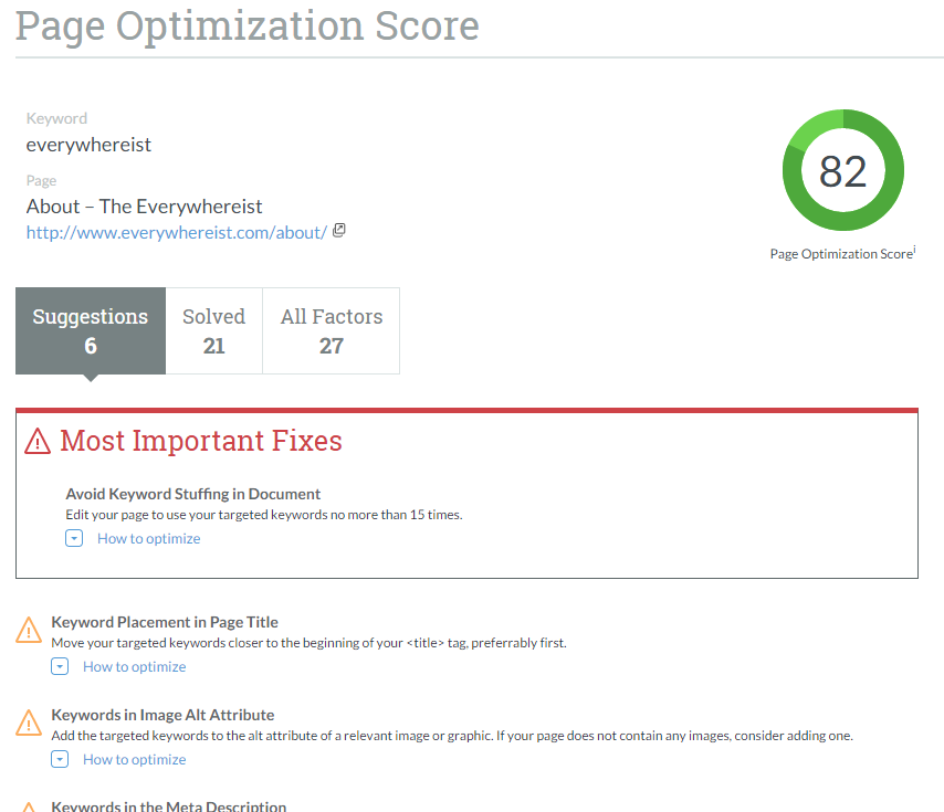 We eliminated letter grades from Page Optimization reports in favor of numerical scores. Scores of 0–100 are more precise than letter grades, and are more universally understood. We also updated relative weighting of page optimization criteria and incorporated updated advice from top SEOs to provide clear, relevant, practical optimization suggestions.