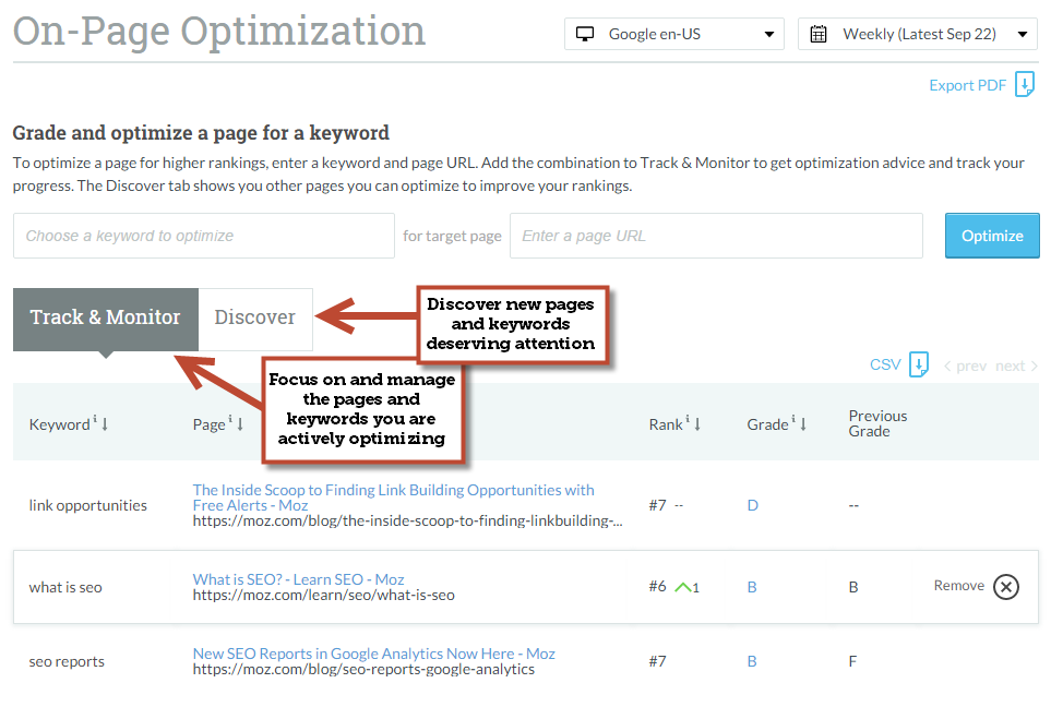 We also made some big improvements to the on-page optimization workflow, adding a brand new page for you to track, monitor, and report on just the pages that you are actively optimizing. We’ve also improved our optimization suggestions, and put them into a separate Discover tab.
